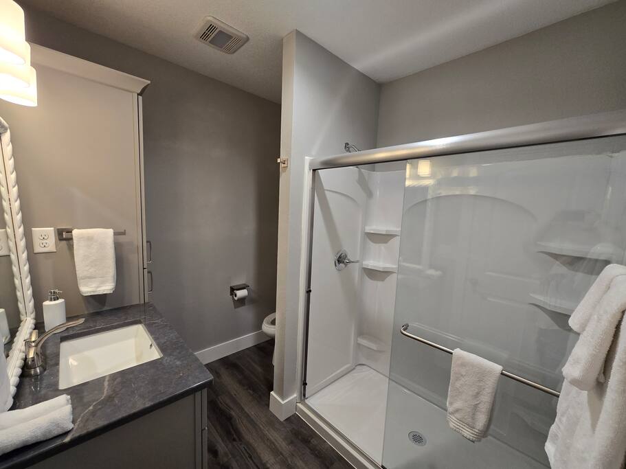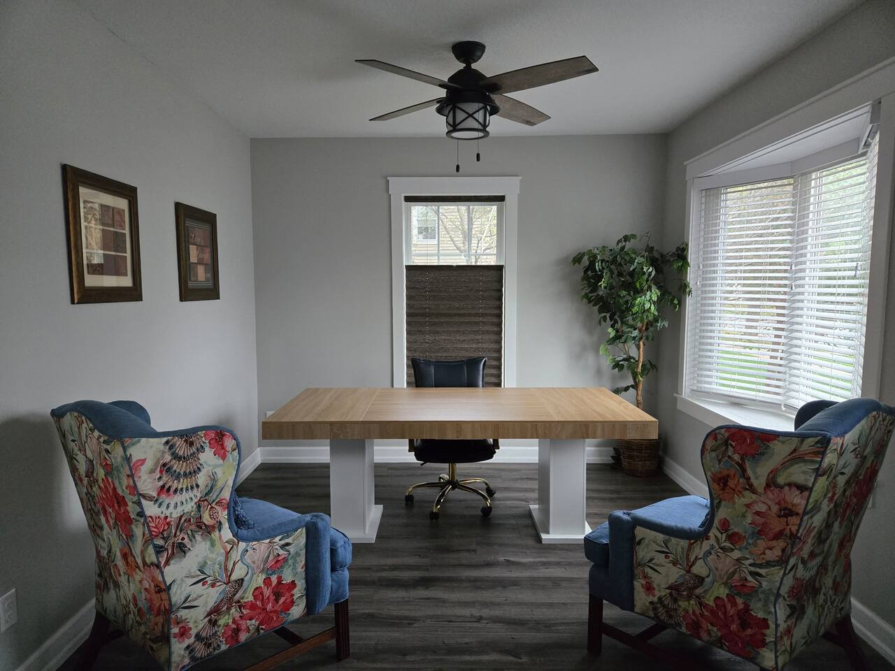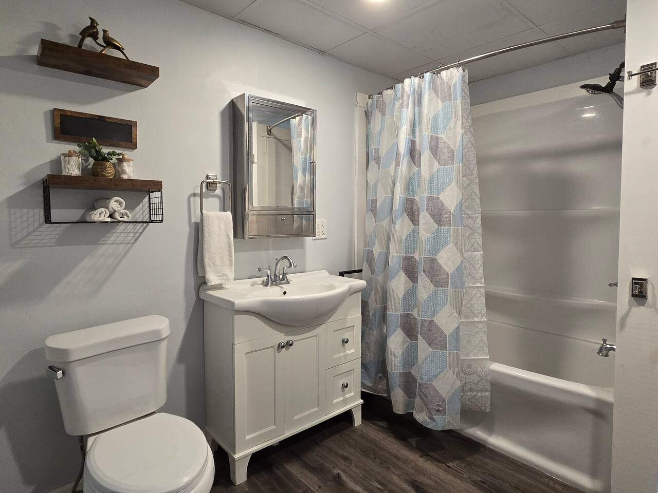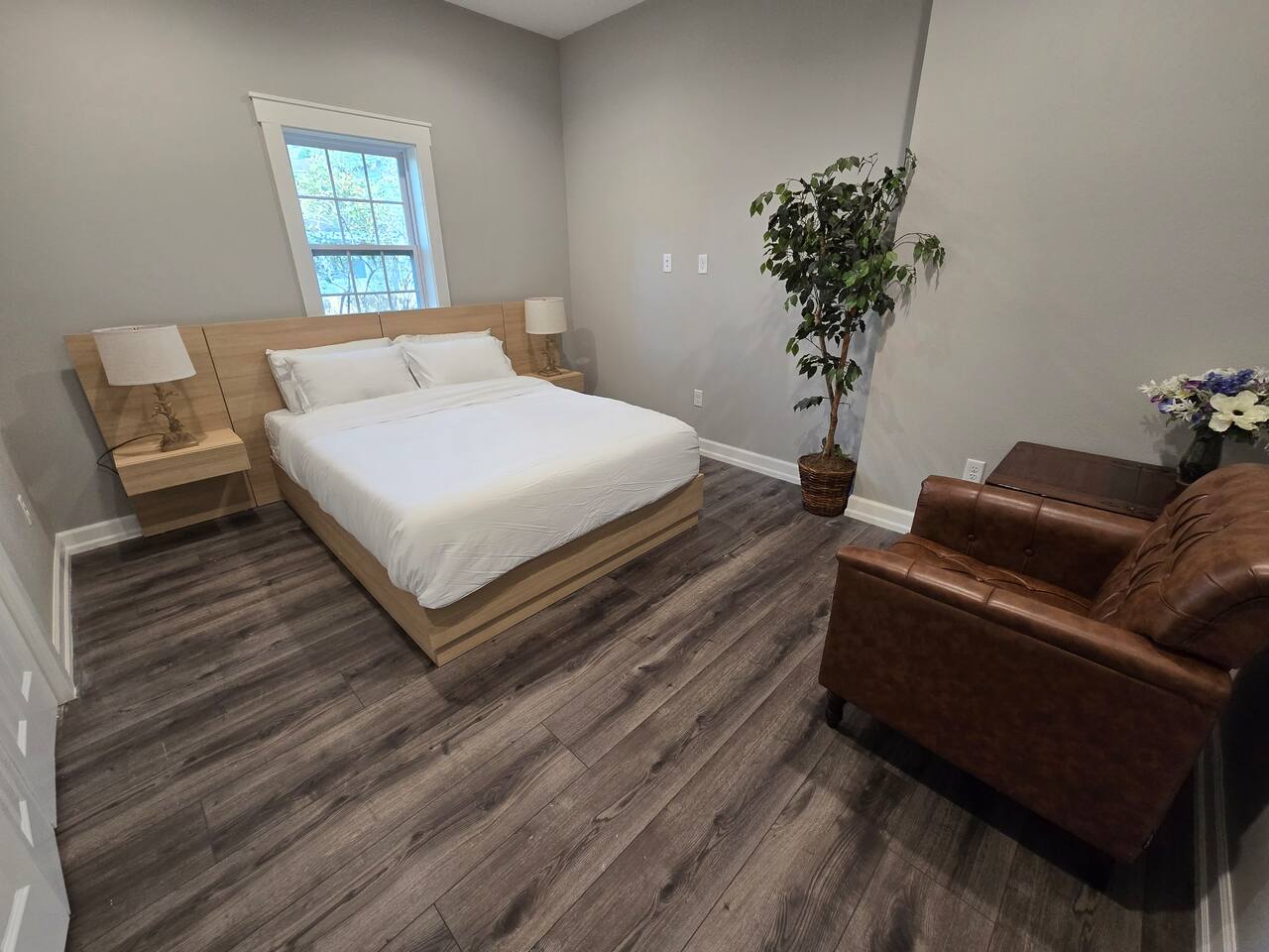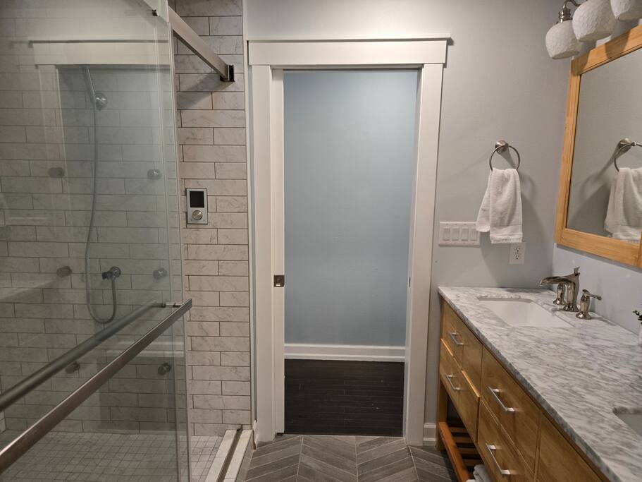 Stunning newly renovated retreat steps from downtown! Features 5 beds (4 queens, 1 king), plus sleeper sofa, modern entertainment space with reclining sectional, elegant bar, spa-like bathroom with marble vanity, spacious side deck. Perfect for groups, families, UNI events. High-end finishes throughout this charming blue historic home with stone accents. Prime location for shopping, dining, entertainment. Walk everywhere! Your upscale Cedar Falls getaway awaits!